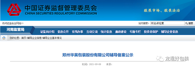 近日,筆者從證監(jiān)會(huì)獲悉,業(yè)內(nèi)知名包裝企業(yè)鄭州華英包裝股份有限公司擬在A股市場首次公開發(fā)行股票并上市,目前正在接受中信建投證券股份有限公司輔導(dǎo),已于2021年9月7日在河南證監(jiān)局進(jìn)行輔導(dǎo)備案。