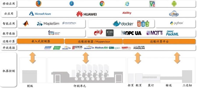 圖1印刷工業全景 1.數字化轉型的認知問題 對于印刷企業必須不為環境所動。數字化轉型是一個很熱門的話題,但是,作為行業的企業,必須避免陷入“為了數字化而數字化”,也不要盲目地去考慮構建系統,而是應該對自身的業務戰略有清晰的認識。數字化轉型,首先是企業的經營模式的變化,而印刷工業作為用戶產品的一個環節,數字化的轉型必須讓自身具有對這種客戶需求的應變能力,并且在這種變化中,還需要保持高的盈利能力,以及品質的提升、交付周期的縮短、響應用戶新訂單的能力。 2.缺乏有效的連接性 數字化在落地中遇到了較為普遍的問題在于真正的連接性問題。我們可以看到,包括印刷包裝設備通常也能夠達到非常先進的水平,采用了國際領先的機器設備,ERP/MES通常也是來自于全球最為知名的廠商,但是,作業水平的連接性卻仍然處于孤島狀態。例如,作業單通常會采用打印方式下發,或者通過計算機網絡下發到機臺,由人工對其參數進行設置,并未實現真正的全連接貫通。這種情形較為普遍,在于數字化并未真正有效地打通ERP/MES和機器之間的這種互操作性連接,因此,雖然有數字化設計、運營管理、先進機器控制與產線運行系統,但是,之間仍然是信息孤島。這個現象至今并未真正得到有效解決。 3.缺乏垂直行業特性的數字化集成 印刷行業屬于較為垂直的細分市場,不像汽車工業、電子制造業,乃至流程工業的產業規模,因此,針對其有效的細分市場數字化系統的服務廠商不多,這使得一些數字化系統不得不由廠商自己搭建,或采用由通用市場的服務商進行修改的運營系統。另外,國內的工業軟件例如針對顏色、印包工廠數字化運營軟件的缺乏,也導致了來自國際廠商的數字化系統缺乏統一的規范與運營,這一現象較為普遍。而國外的大廠雖然有專業系統,但通常由少數大型OEM提供,像XJDF規約基礎上的整個印刷工廠的管理軟件,是僅部分大廠在其數十年的發展歷史上構建起來的。這些對于國內產業起步晚、規模小的企業來說都是無法實現的,因為這不僅需要領先的機電控制與工藝,也需要較大的市場支撐以及產業人才的培養。 印刷工業的數字化轉型需求分析 對于如何推進數字化轉型,市場上有兩個主要的推進力量,一個是來自ICT廠商構建的“自上而下”的推進,其關注點在“平臺”建設。由于ICT通常屬于工具類的提供商,因此,他們的實現都是提供平臺,需要用戶自行在其上開發自己的應用。例如,如何進行物流、信息流的定義,而ICT廠商還缺乏對現場的認知,因此,僅能提供工具性的,而這依賴于具有掌握信息化能力的企業自行來配置系統。另一個方向則是來自于OT,如自動化廠商、機械廠商自行“自下而上”的數字化推進。 作為自動化廠商,貝加萊是一個在印刷控制技術領域有著非常深厚積累的企業,包括各種印刷機的控制以及控制系統本身的通信連接能力、數字化分析與應用能力,這使得OT廠商具有離現場更近、更了解現場的需求。在此,我們從這個視角展開來介紹印刷企業應該如何實現數字化。 1.統一規范的語義連接 首先,工業通信除了解決實時控制,同時也在不斷的擴展,尤其是OPCUA語義互操作規范的集成,使得目前的自動化廠商均可提供機器-機器、機器-管理系統之間的數據交互能力。 第二則是其信息建模的能力,在OPCUA基礎建模中,包括了對信息的結構化定義的統一規范,以及數據的調用、方法的集成能力,同時它也有行業信息模型。像針對機床的MTConnect包裝的PackML,但是,對于印刷,JDP/XJDF這類目前尚未采用OPCUA規范來定義。這是一個可能需要整個印刷行業或者由本土印刷機械、用戶共同來定義的規范。 通信行規規范的意義在于能夠讓數字化運營管理與機器制造商、數字化設計之間構建一個統一的規范,使得在信息集成中、數據應用中能夠快速地進行工程連接,降低工程成本,否則,每個企業的數字化路徑都會是一個“工程項目”。這種缺乏可復制性的實現路徑,最終會導致整個產業難以實現或實現成本極高,反倒阻礙其實現的效率。 另外,產業對于OPCUA類似的信息模型了解較少,這需要行業組織對其進行推廣,并與國際組織協同,共同開發具有本土特點的自主規范。 2.從現場視角的邊緣實現 貝加萊控制系統能夠提供的數字化能力,如圖2所示,包括以下幾個方面: