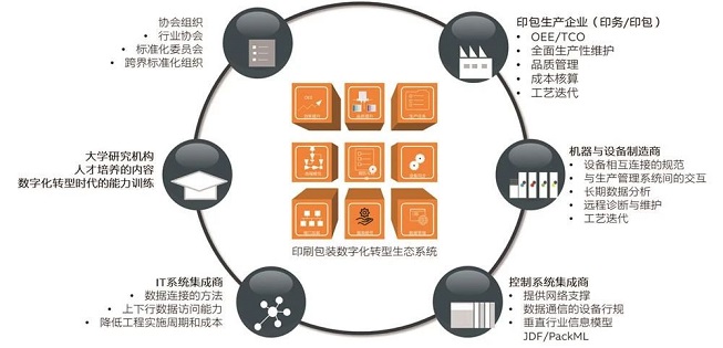 圖4整體的數字化架構 1)對于機器的設計而言,MATLAB/Simulink的建模仿真可以與貝加萊的控制系統設計平臺AutomationStudio之間進行連接,這樣數字化設計可以連接到控制,協同仿真。第二種情況目前尚未被驗證,即數字化的JDF文件可以被XML格式讀取,并解析,這個現階段可以采用控制器的讀取任務來實現,可以通過程序解析作業單,并下發到機器上,自動與配方系統結合,從而實現自動運行。當然,其工作流程需要人員確認,避免錯誤發生。 2)OPCUA的通信連接:OPCUA不僅能夠提供作業單任務,它的各種信息模型如視覺與機器人、AutoID的原材料條碼進入、物流倉儲信息集成,包括控制器間的交互、與云端的交互均可實現。 印刷工業數字化需要協作 為了實現數字化轉型,對于印刷工業來說需要各方進行協作,并在協會、標委會組織下,共同制定可行的產業整體規劃,這是一個需要通盤推進的工作。其產業生態構建如圖5所示,在此對各方的工作提出以下建議:  圖5數字化轉型中產業生態協作問題 首先,對于印包企業,也包括終端用戶,需要清晰自己的數字化需求。這些不僅為了自身的運營管理水平數字化升級,也包括對上游的機械制造商、系統集成商、信息化集成商提出規約,這樣才會有共同努力的方向。 其次,在產業需求的基礎上,由協會組織如印刷行業協會、標委會以及跨界的如OPC基金會、自動化行業的通信規約、數字化車間標準化組織來共同開發針對印刷工業的行業規約,通過產業協同來為產業制定數字化發展的指南、指導,從而推進產業整體發展。 再次,機器制造商、自動化廠商開展協作,將在其他領域的數字化經驗、技術、方法與印刷行業的產業實際結合,開發致力于解決質量、成本、效率提升的解決方案。 總而言之,印刷工業的數字化并非一蹴而就,也不是單個方面可以推進的,需要產業的廠商共同努力。