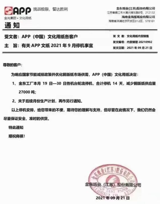 同一時(shí)間,APP(中國)文化用紙也傳出停機(jī)的消息。9月21日,金東紙業(yè)(江蘇)股份有限公司發(fā)布有關(guān)APP文紙2021年9月停機(jī)事宜的函稱,為響應(yīng)國家節(jié)能減排政策并優(yōu)化銅版紙市場供需,APP(中國)文化用紙決定: 1、金東工廠本月19日-30日各機(jī)臺輪流停機(jī),合計(jì)停機(jī)14天,減少銅版紙供應(yīng)量27000噸; 2、關(guān)于后續(xù)月份生產(chǎn)計(jì)劃,再作另行通知。