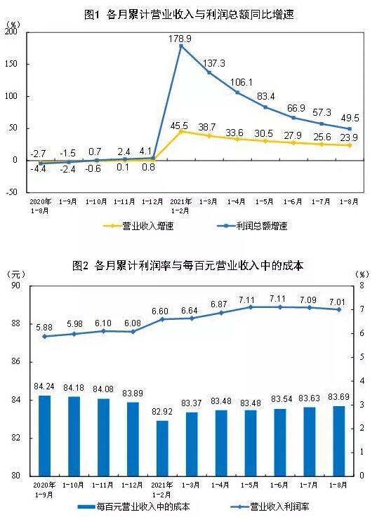 1—8月份,規(guī)模以上工業(yè)企業(yè)實現(xiàn)營業(yè)收入80.00萬億元,同比增長23.9%;發(fā)生營業(yè)成本66.95萬億元,增長23.0%;營業(yè)收入利潤率為7.01%,同比提高1.20個百分點。其中,造紙和紙制品業(yè)實現(xiàn)營業(yè)收入9527.2億元,同比增長20.5%;印刷和記錄媒介復(fù)制業(yè)實現(xiàn)營業(yè)收入4546.2億元,同比增長14.8%。 8月末,規(guī)模以上工業(yè)企業(yè)資產(chǎn)總計135.40萬億元,同比增長9.2%;負債合計76.38萬億元,增長8.4%;所有者權(quán)益合計59.02萬億元,增長10.2%;資產(chǎn)負債率為56.4%,同比降低0.4個百分點。 8月末,規(guī)模以上工業(yè)企業(yè)應(yīng)收賬款18.12萬億元,同比增長12.1%;產(chǎn)成品存貨5.20萬億元,增長14.2%。 1—8月份,規(guī)模以上工業(yè)企業(yè)每百元營業(yè)收入中的成本為83.69元,同比減少0.65元;每百元營業(yè)收入中的費用為8.39元,同比減少0.57元。 8月末,規(guī)模以上工業(yè)企業(yè)每百元資產(chǎn)實現(xiàn)的營業(yè)收入為91.5元,同比增加10.7元;人均營業(yè)收入為163.7萬元,同比增加31.6萬元;產(chǎn)成品存貨周轉(zhuǎn)天數(shù)為17.6天,同比減少1.8天;應(yīng)收賬款平均回收期為51.6天,同比減少4.4天。 8月份,規(guī)模以上工業(yè)企業(yè)實現(xiàn)利潤總額6802.8億元,同比增長10.1%。 國家統(tǒng)計局工業(yè)司高級統(tǒng)計師朱虹解讀工業(yè)企業(yè)利潤數(shù)據(jù)表示,2021年8月份,工業(yè)生產(chǎn)穩(wěn)中有進,企業(yè)經(jīng)營狀況繼續(xù)改善,利潤保持穩(wěn)定增長態(tài)勢。8月份,全國規(guī)模以上工業(yè)企業(yè)利潤同比增長10.1%,比2019年同期增長31.1%,兩年平均增長14.5%。從1—8月份累計看,規(guī)模以上工業(yè)企業(yè)利潤同比增長49.5%,比2019年同期增長42.9%,兩年平均增長19.5%。 總體來看,盡管受到散發(fā)疫情和汛情沖擊及同期基數(shù)較高影響,8月份規(guī)模以上工業(yè)企業(yè)利潤仍然保持穩(wěn)定增長,企業(yè)經(jīng)營狀況繼續(xù)向好。需要關(guān)注的是,局部地區(qū)仍有散發(fā)疫情,大宗商品價格總體高位運行、國際物流成本較高、芯片短缺等問題仍在推高企業(yè)成本,企業(yè)利潤持續(xù)穩(wěn)定恢復(fù)面臨較多挑戰(zhàn)。