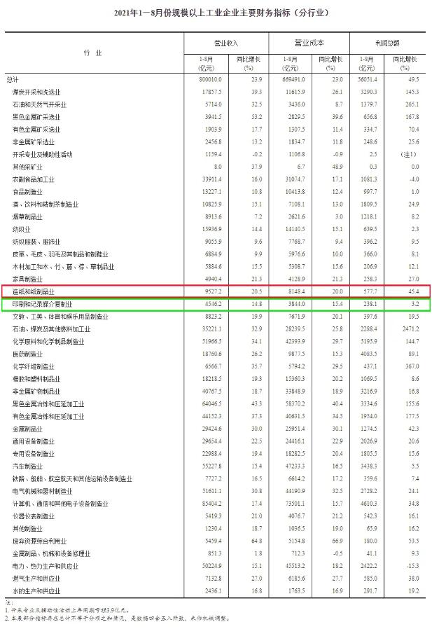 1—8月份,采礦業(yè)實現(xiàn)利潤總額5913.0億元,同比增長1.51倍;制造業(yè)實現(xiàn)利潤總額46839.5億元,增長48.2%;電力、熱力、燃氣及水生產(chǎn)和供應(yīng)業(yè)實現(xiàn)利潤總額3298.9億元,下降6.5%。 1—8月份,在41個工業(yè)大類行業(yè)中,37個行業(yè)利潤總額同比增長,1個行業(yè)扭虧為盈,1個行業(yè)持平,2個行業(yè)下降。主要行業(yè)利潤情況如下:石油、煤炭及其他燃料加工業(yè)利潤總額同比增長24.71倍,石油和天然氣開采業(yè)增長2.65倍,有色金屬冶煉和壓延加工業(yè)增長1.78倍,黑色金屬冶煉和壓延加工業(yè)增長1.56倍,化學(xué)原料和化學(xué)制品制造業(yè)增長1.45倍,煤炭開采和洗選業(yè)增長1.45倍,計算機、通信和其他電子設(shè)備制造業(yè)增長34.8%,電氣機械和器材制造業(yè)增長24.1%,通用設(shè)備制造業(yè)增長20.6%,非金屬礦物制品業(yè)增長16.8%,專用設(shè)備制造業(yè)增長15.6%,汽車制造業(yè)增長5.5%,紡織業(yè)增長2.3%,農(nóng)副食品加工業(yè)下降4.0%,電力、熱力生產(chǎn)和供應(yīng)業(yè)下降15.3%。 值得關(guān)注的是,造紙和紙制品業(yè)實現(xiàn)利潤總額577.7億元,同比增長45.4%;印刷和記錄媒介復(fù)制業(yè)實現(xiàn)利潤總額238.1億元,同比增長3.2%。