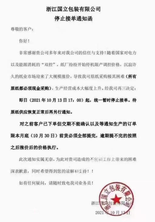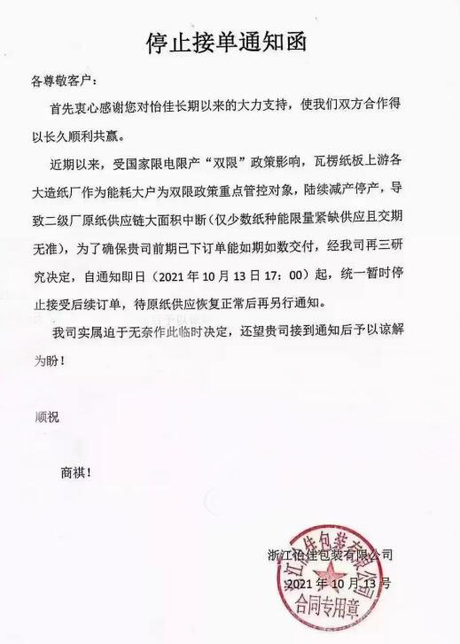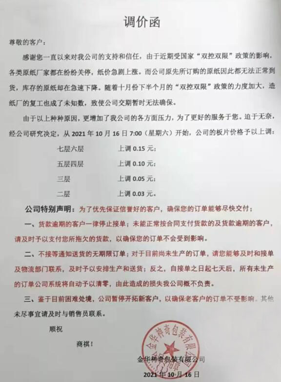 這樣的情況并非少數(shù)。金華神奇包裝有限公司就在調(diào)價函中透露:“公司原先所訂購的原紙無法正常到貨,庫存原紙急速下降。隨著10月下半月雙控雙限政策的力度加大,造紙廠的復工成了未知數(shù),致使公司交期暫時無法確保。”