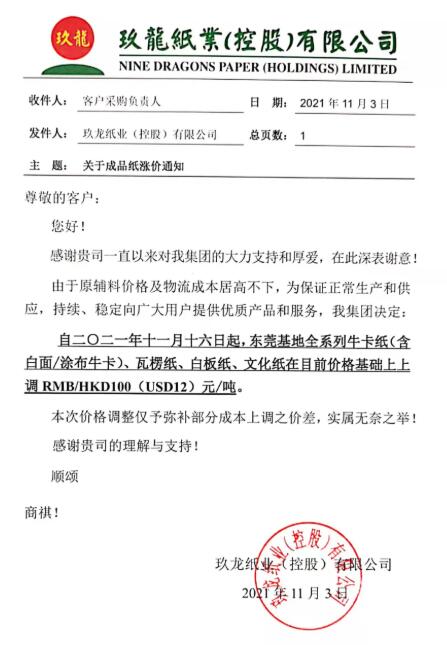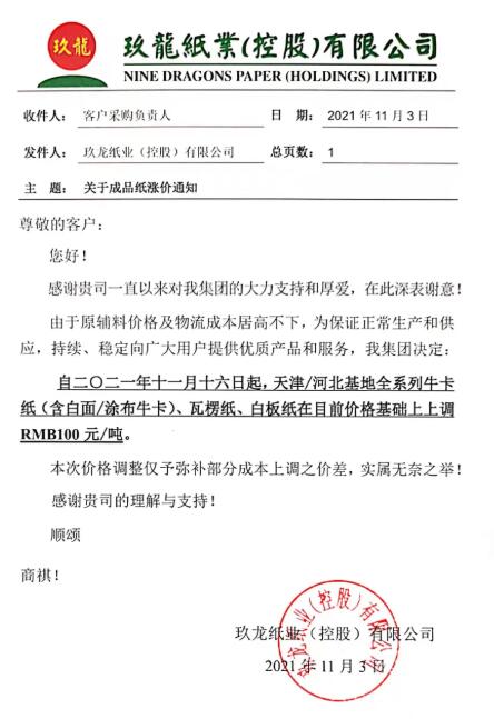 11月1日,玖龍紙業各基地紙種全線上漲,落實此前宣布的100-150元/噸的漲幅。時隔兩日后,玖龍紙業又發出新的漲價函,旗下各大基地將從11月16日起100元/噸。這將是玖龍紙業在11月份的第二輪漲價,也是自9月底以來的第七輪上調。 東莞玖龍 自11月16日起,東莞基地全系列牛卡紙(含白面/涂布牛卡)、瓦楞紙、白板紙、文化紙在目前價格基礎上上調漲價100元/噸。
