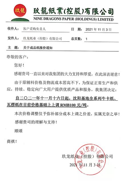 沈陽玖龍 自11月16日起,沈陽基地全系列牛卡紙、瓦楞紙在目前價格基礎上上調漲價100元/噸。