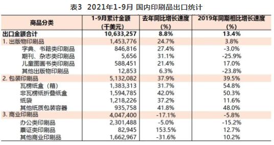 同期,國內印刷品出口106.33億美元(詳見表3),同比增長8.8%、比2019年同期增長13.4%。其中,出版物印刷品出口14.54億美元(同比增長24.7%、比2019年同期增長3.8%)、包裝印刷品出口51.32億美元(同比增長37.9%、比2019年同期增長39.5%)、商業印刷品出口40.47億美元(同比下降17.1%、比2019年同期下降5.8%)。 表3 2021年1-9月 國內印刷品出口統計