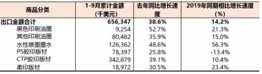 同期,國內印刷裝備出口20.82億美元(詳見表5),較去年同期增長40.8%、比2019年同期增長17.5%。其中,印前設備出口1.21億美元(同比增長22.4%、比2019年同期增長5.7%)、印刷設備出口11.59億美元(同比增長39.0%、比2019年同期增長10.6%)、印后設備出口8.02億美元(同比增長46.9%、比2019年同期增長31.3%)。 相關設備主要子項出口,計算機直接制版機3223.7萬美元(同比增長19.8%、比2019年同期下降24.6%)、膠印機8482.2萬美元(同比增長27.1%、比2019年同期增長19.2%)、凹版印刷機4638.9萬美元(同比增長59.5%、比2019年同期增長13.9%)、柔版印刷機4936.7萬美元(同比增長18.0%、比2019年同期下降8.1%)、絲網印刷機7096.1萬美元(同比增長59.2%、比2019年同期增長13.6%)、凸版印刷機3578.3萬美元(同比增長47.0%、比2019年同期增長8.1%)、數字印刷機5.93億美元(同比增長31.7%、比2019年同期增長3.4%)、印刷輔機和零件2.17億美元(同比增長78.3%、比2019年同期增長46.5%)、書刊裝訂設備2340.5萬美元(同比增長27.1%、比2019年同期下降6.9%)、包裝印后設備3.58億美元(同比增長40.6%、比2019年同期增長45.9%)。 同期,國內印刷裝備進出口貿易順差1.71億美元(同比下降27.7%、比2019年同期下降39.4%)。 國內印刷器材進出口概況 2021年1-9月國內印刷器材進口3.74億美元(參見表6),同比增長19.5%、比2019年同期增長13.7%。其中,黑色印刷油墨1445.64噸、4839.3萬美元(同比增長0.7%、比2019年同期增長20.2%)、其他印刷油墨6706.59噸、1.79億美元(同比增長10.6%、比2019年同期增長8.0%)、水性噴墨墨水5463.23噸、1.07億美元(同比增長42.5%、比2019年同期增長13.5%)、PS膠印版材1.76萬平方米、37.5萬美元(同比增長4.3%、比2019年同期下降19.6%)、CTP膠印版材284.66萬平方米、1211.7萬美元(同比增長176.3%、比2019年同期增長193.9%)、柔印版材51.99萬平方米、2780.5萬美元(與上年增長17.1%、比2019年同期增長12.5%)。 表6 2021年1-9月 國內印刷器材進口統計
