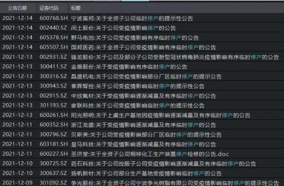 近期,國內疫情零星爆發。 廣東、江蘇、浙江多地局部封控, 全國多地暫時停產停工停業! 疫情催迫下, 大量工廠也提前放假了!  ▶廣東:東莞再增2例本土確診病例 據廣東衛健委網站,12月17日0-24時,全省新增本土確診病例2例,均為東莞報告,1例在納入集中隔離觀察的密接中發現,1例在大規模人群核酸篩查中發現。全省新增境外輸入確診病例5例,其中1例為無癥狀感染者轉確診,廣州報告3例,分別來自老撾、馬來西亞和伊朗;深圳報告2例,均來自美國。新增境外輸入無癥狀感染者3例,深圳報告2例,均來自委內瑞拉;佛山報告1例,來自沙特阿拉伯。新增出院2例,目前在院67例。  根據國家和省關于應對新冠肺炎疫情分區分級防控的工作要求,經東莞市新冠肺炎防控指揮部同意,自2021年12月16日起,大朗鎮大井頭社區大朗碧桂園首座3棟、蔡邊村沙井街76-80號、蔡邊村金麗路五巷20號、蔡邊村九墩區112號、長塘社區第一工業區一街92-146號、長塘社區三區一路197-199號君安雅居、大井頭社區怡安路63號怡安時尚公寓、水平村紅荔西區金寶公寓由低風險地區調整為中風險地區,其他地區風險等級不變。 12月14日起,廣州封閉地鐵5號線淘金站B出入口,管控區域部分公交站點有所調整,暫停防范區內的巡游車、網約車運營。14日6時起,所有從白云機場乘機出發的旅客,在測溫和查驗健康碼的基礎上,須查驗行程碼。  ▶江蘇:部分高速入口關閉 江蘇徐州:停課、高速入口關閉。全市暫停線下教學,徐州周邊徐州南、徐州西、柳新、呂梁、東探收費站入口關閉,出口正常通行,徐州、徐州東、徐州北、漢王、彭城五個收費站正常開通,高速入口查驗48小時核酸檢測證明,請配合疫情防控工作,提前準備核酸檢測報告。 ▶浙江:大廠相繼停產 為遏制疫情擴散,浙江已有多家大型企業宣布停產。截至12月13日,發布了臨時停牌公告的17家A股上市公司中,11家都處于上虞區,主要集中于化工產業、機械零部件等產業。 停產企業如下:  ▶黑龍江:停工停產停業  訥河市發布第51號公告,強化社會面管控。保障社會生活運轉業態,其他業態一律停工停產停業。出租車、公交車、長途客運車輛等公共交通暫停營運。所有民營醫院對現有住院患者封閉管理,停止接診;所有個體診所、門診部、社區衛生服務中心(站)、村衛生所暫停營業。學校、幼兒園及培訓機構實行線上教學。 工廠提前放假!提防貿易商拋貨引發“踩踏風險”! 疫情零星爆發、下游行情慘淡,不少工廠訂單量驟減。多以老客戶翻單訂單、小批量為主,很多工廠訂單稀少,為了節約成本,會提前開啟放假模式。受疫情和市場的影響,今年的放假似乎比之前來得要早一些。    當前貿易商年底資金壓力急劇增加,需要警惕貿易端拋售庫存引發的“踩踏風險”。 塑料供應商老板突然跑路引發賣家熱議近日,還有一則爆料稱,中山市某塑料廠老板突然跑路,毫無征兆,給了員工當頭一棒。據員工發視頻爆料,前一天晚上加班還好好的,第二天一早上班發現人去樓空,老板跑路了,并且還欠員工三個月的工資沒發。  視頻中,員工用紅色的幾個大字表達著不滿:“因為信任,往往容易被騙”“老板你的良心不會痛嗎?”  從視頻截圖中可以看到,公司里一片混亂,只剩下一些沒使用完的材料和工具。此消息一出,引來了眾多賣家關注,大家都對該公司老板表達了譴責之意。“這樣做老板,估計一輩子都發不了財。得民心者得天下。失民心者失天下。格局還是太小了。”“永遠不要跟資本家談良心!跟員工談理想的老板底子都虛,記住,不管什么糖衣炮彈,自己出力就是為了掙錢!”圖片  其實,要不是實在沒辦法了,老板也不會一走了之,在網格化管理與視頻監控之下,沒有哪個老板真正能跑得掉的。在疫情擾動的兩年時間,老板們承受的痛苦不可想象,說多了都是淚。不過,背負著房貸車貸的打工者也不容易,就算公司要倒閉解散,老板也應該考慮到大家共事一場,給員工一個交代。受疫情影響,各行各業都不景氣,中小企業的境況更加艱難,不是每個企業老板都能做到善始善終的。