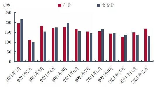 2021年瓦楞紙均價為4091元/噸,較2021年均價上漲642元/噸,漲幅為18.62%。5月下旬開始至10月底,瓦楞紙市場主流價整體維持上揚態勢,10月上旬漲幅進一步擴大。10月份瓦楞紙均價上漲559元/噸,漲幅為13.51%。期間雖有9月中上旬紙企為去庫連續執行優惠政策,然受限電政策影響,9月份行業開工率明顯下降,故9月底開始瓦楞紙價格再次進入上行通道,10月份紙價大幅上漲。 四季度瓦楞紙市場呈現先漲后跌的態勢。主因終端需求疲軟,加之下游包裝企業多于10月份儲備部分原紙庫存,訂單不佳的情況下,下游包裝企業以消化庫存為主,原紙采買積極性下降。另外11月初各省份限電政策逐步松綁,供應增加下,瓦楞紙市場供需矛盾凸顯,推動紙價繼續下跌。12月份終端需求持續維持旺季不旺的景象,下游需求萎靡不振。下游包裝企業原紙庫存雖已降至中低位水平,然因需求低迷且下游企業多對后市持看空心態,故多隨用隨采為主,春節前建倉意愿較低,紙企方面庫存承壓下價格持續下行。 二、2021年瓦楞紙市場產銷分析 圖2 2021年瓦楞紙產銷對比圖