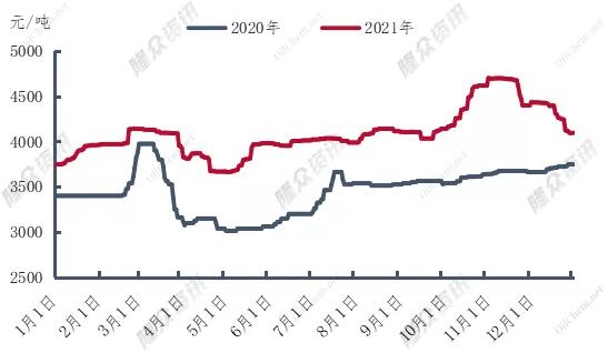 導語:原料成本推動下,2021年瓦楞紙價格同比大幅增長,然受公共衛生事件、極端天氣及“能耗雙控”等因素影響下,瓦楞紙供應量較去年呈小幅下滑趨勢。紙企出貨量亦同比下降。2021年紙企出貨量同比下降2.41%。主因2021年四季度下游市場旺季不旺,需求萎縮所致。 一、瓦楞紙價格走勢分析 圖1 2020-2021年瓦楞紙價格走勢圖