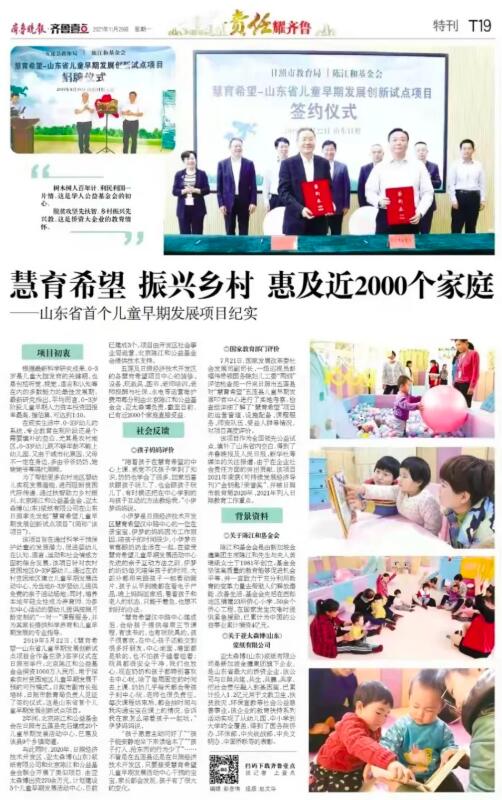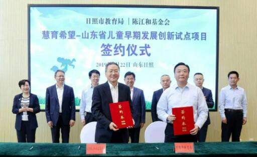 2019年5月22日,《慧育希望—山東省兒童早期發(fā)展創(chuàng)新試點(diǎn)項(xiàng)目合作備忘錄》簽字儀式在日照市舉行。北京陳江和公益基金會(huì)捐資1000萬人民幣,用于探索農(nóng)村貧困地區(qū)兒童早期發(fā)展干預(yù)的可行模式。日照市副市長張培林、日照市教育局負(fù)責(zé)人見證了簽約儀式。這是山東省首個(gè)兒童早期發(fā)展創(chuàng)新試點(diǎn)項(xiàng)目。 2年間,北京陳江和公益基金會(huì)在日照市五蓮縣先后建成20個(gè)兒童早期發(fā)展活動(dòng)中心,已惠及該縣9個(gè)鄉(xiāng)鎮(zhèn)街道。