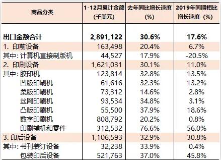 同期,國內印刷器材進出口貿易順差4.41億美元(同比增長107.9%、較2019年同期增長31.9%)。 本期觀察 總結: 2021年1-12月國內印刷產業相關商品進出口總值達242.50億美元。同期,印刷品、印刷裝備、印刷器材三大類商品進出口均實現穩定持續增長,三類商品的進口和出口規模不僅超越2020年同期水平,且較2019年同期也有較大幅度增長: 與2020年同期相比,國內印刷品進口增長8.3%、出口增長19.1%;印刷裝備進口增長39.4%、出口增長30.6%;印刷器材進口增長12.9%、出口增長43.4%; 與2019年同期相比,其中,國內印刷品進口增長0.6%、出口增長16.1%;印刷裝備進口增長25.5%、出口增長17.6%;印刷器材進口增長13.1%、出口增長21.1%。 與2020年同期相比,2021年1-12月國內印刷品、印刷裝備、印刷器材進口、出口增長較快的前五位商品類別如下: 進口:其他出版物印刷品(+226.3%)、印刷輔機和零件(+61.2%)、其他紙質包裝容器(+58.7%)、膠印機(+50.5%)、計算機直接制版機(+47.7%); 出口:印刷輔機和零件(+76.6%)、票證類印刷品(+63.4%)、CTP膠印版材(+49.7%)、其他印刷油墨(+38.7%)、水性噴墨墨水/PS膠印版材(+38.2%)。 同期,國內印刷品、印刷裝備、印刷器材進出口相對萎縮的商品類別如下: 進口:柔版印刷機(-45.6%)、 凹版印刷機(-39.7%)、期刊雜志類印刷品(-29.9%)、凸版印刷機(-27.1%)、兒童圖畫書類印刷品(-17.4%)、包裝印后設備(-15.4%); 出口:辦公類印刷品(-6.0%)。 有關2021年國內印刷產業進出口商品的規模、結構、分布的特點、與以往年份相比國內印刷產業進出口商品的規模、結構、分布的變化、相關商品子項進出口數量和價格的詳細信息,近期推出的《2021年國內印刷產業相關產品進出口年度報告》將進行深入分析探討。同時,2022年1月1日開始實施的《區域全面經濟伙伴關系協定》(RCEP)對國內印刷產業進出口商品的影響也將在年度報告中有專題討論。敬請關注!