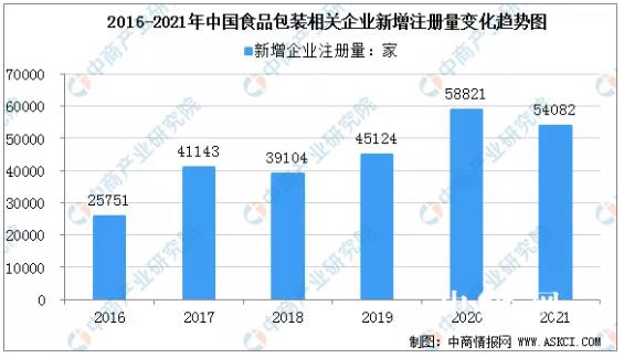 2016-2020年,我國食品包裝相關(guān)企業(yè)新增量呈穩(wěn)步上升的趨勢,這反映行業(yè)入局者逐漸增多,市場競爭日益激烈。2020年我國食品包裝相關(guān)企業(yè)新增量達58821家,相較上年增加近14000家,在雙碳政策加緊推進之下,2021年中國食品包裝相關(guān)企業(yè)新增量有所下降,為54082家。