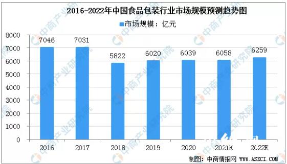 食品包裝是包裝工業(yè)的大戶,占整個包裝業(yè)市場份額的60%左右。由于對環(huán)境保護施加了更為嚴格的法規(guī)要求,導致近年來中國包裝行業(yè)架構(gòu)變化以及包裝企業(yè)數(shù)量和包裝產(chǎn)品銷量嚴重下降,新冠疫情得到有效控制后,各種包裝材料需求持續(xù)增加,2020年食品包裝行業(yè)市場規(guī)模在6039億元左右,中商產(chǎn)業(yè)研究院預計2022年中國食品包裝行業(yè)市場規(guī)模將回升至6259億元。