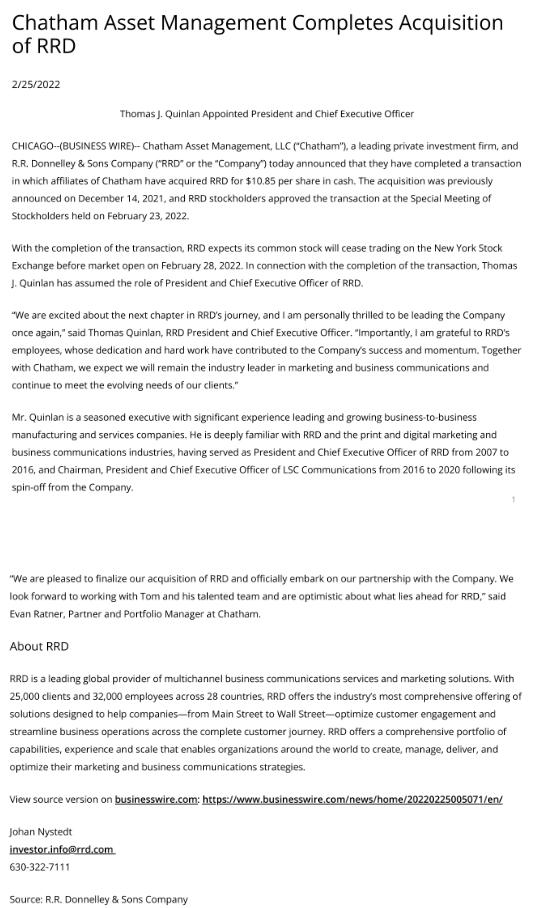 在收購傳聞發(fā)出后,其股票狂漲了50%還多,最終價格定格在10.84美元,總市值僅為8.53億美元,足見這家曾經(jīng)的美國500強企業(yè)的落寞與衰敗。 美國當(dāng)納利集團(RR Donnelley)擁有超過158年歷史,總部位于芝加哥是全球領(lǐng)先的整合傳播方案服務(wù)商。2012年,當(dāng)納利全球銷售額超過102億美金,目前已發(fā)展成為全球第二大的商業(yè)印刷公司,它與加拿大“魁北克”、日本“大日本”和“凸版”等印刷公司并稱全球業(yè)界四大巨頭。當(dāng)納利在北美、亞洲、拉丁美洲以及歐洲共設(shè)有600多家分支機構(gòu),員工總數(shù)超過42000人。其中,當(dāng)納利亞洲擁有9000多名員工,分別在北京、東莞、成都、廣州、香港、臺灣、昆山、濰坊、安陽、日本、韓國和澳大利亞等地開設(shè)生產(chǎn)以及服務(wù)機構(gòu) 。 2016年,當(dāng)納利拆分成為三家獨立運營的上市公司。它們分別為當(dāng)納利語言解決方案(DonnelleyLanguageSolutions),湖畔經(jīng)典傳播(LSCCommunications),和當(dāng)納利公司(RRD)。其中,LSC Communications于2020年被Atlas控股收購。如今RRD也被Chatham公司以21億美元收購。 2021財年,當(dāng)納利營業(yè)收入僅為49.64億美元,歸母凈利為370.00萬美元,同比下降96.24%。 隨著人類閱讀迅速從紙媒時代切換到電子媒介時代,當(dāng)納利并未像“大日本”和“凸版”等印刷公司那樣從芯片、新材料等領(lǐng)域找到新的增長點。而不斷地收購導(dǎo)致公司運營負擔(dān)日益沉重,負債率高企,贏利能力下滑。 而擊敗了Atlas控股的Chatham公司,在收購RRD之后,必將對人員冗雜、債務(wù)纏身的當(dāng)納利進行大刀闊斧的改革。 那么,擁有9000員工的當(dāng)納利亞洲業(yè)務(wù)的命運將會怎樣呢? 值得得注意的是,盡管當(dāng)納利亞洲業(yè)務(wù)稱得上優(yōu)質(zhì)資產(chǎn),但Chatham公司在致當(dāng)納利董事會的公開信中明確提出要重新評估當(dāng)納利的海外業(yè)務(wù),特別是在中國的亞洲印刷和包裝業(yè)務(wù)。Chatham公司在公開信中,用了一段很長的文字來闡述出售亞洲業(yè)務(wù)的好處。比如,出售收益可以用于償還當(dāng)納利的負債,從而每年節(jié)省超過2500萬美元的利息支出,提高當(dāng)納利的股息和股票價格。 2020年12月,市場曾經(jīng)風(fēng)傳當(dāng)納利欲以8億美元的價格,出售亞洲業(yè)務(wù),緋聞下家為上海某上市公司,可惜后來卻不了了之。 如今,印刷技術(shù)雖然在產(chǎn)品包裝、芯片制造、電路版等領(lǐng)域熠熠生輝,或許,憑借美國強大的技術(shù)儲備,重新上路的當(dāng)納利能夠開拓出新的賽道,重現(xiàn)昔日榮光。