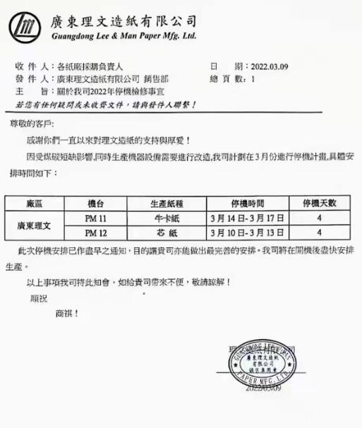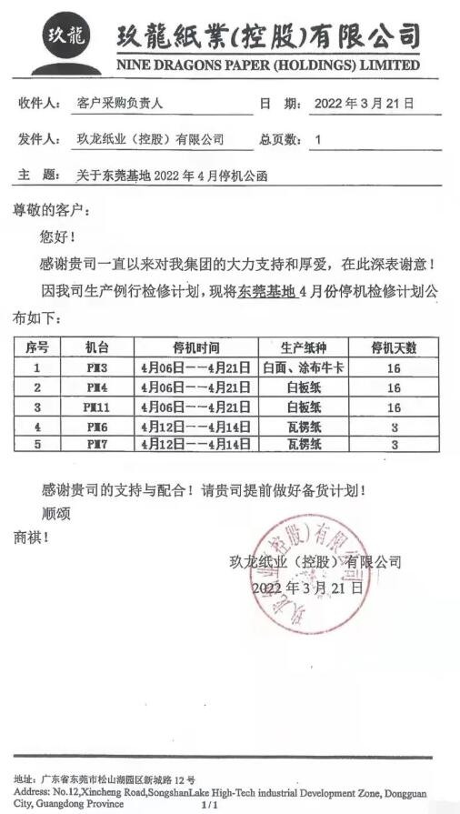 值得一提,就在此前的3月21日,東莞玖龍停機檢修通知也已公布:生產白面、涂布牛卡的PM3、生產白板紙的PM4和PM11均將在4月6日-4月21日期間停產16天;生產瓦楞紙的PM6和PM7將在4月12日-4月14日停產3天。預計一共減產6.8萬噸。