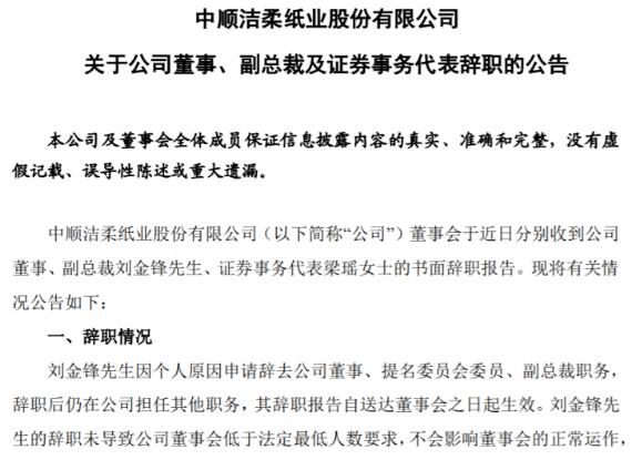 過去一年里高管接連辭任,至今管理層“換血”仍未停,中順潔柔(002511.SZ)24日晚公告顯示,公司董事、副總裁劉金鋒以及證券事務代表梁瑤已向公司遞交書面辭職報告。 劉金鋒,男,1976 年出生,中國國籍,無境外永久居留權,本科學歷,EMBA學歷。2005年8月至2008年5月擔任APP生活用紙事業部華中大區湖南省經理;2008年6月至2009年1月擔任APP中國生活用紙事業部華中、西北大區總經理;2009年2月至2013年4月擔任 APP中國生活用紙事業部華中、西北大區 BU 運營總經理;2013年5月至2014年12月擔任APP中國生活用紙事業部中區VP,其中2014年9月至2015年3月兼全國戰略品牌營銷總經理兼上海元則勝貿易有限公司總經理。2015年4月至今擔任中順潔柔營銷副總裁,2015年9月起擔任公司董事,2018年1月起擔任公司副總經理。