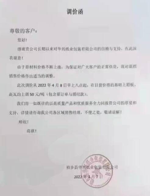 紙企的調價動向,迅速引起下游包裝市場強烈反應,華中、華東等地區的多個城市的紙板價格出現上調,漲幅多為3%-5%。至此,這輪漲價潮已初具規模,持續時間從三月底至今,涉及地區亦越來越廣。 不難發現,華中地區的紙板漲幅相對較高,多為5%,且對客戶每天的下單量和交期有著明確要求。而華東地區的紙板漲幅雖然相對不高,但不少企業對特殊材質訂單額外加價。總體而言,華中、華東地區的紙板整體漲幅幾乎相當。 金華市坤隆包裝有限公司:從4月7日11點開始,雙瓦上調0.1元/單平方,單瓦上調0.05元/單平方。 東陽市大鷹包裝有限公司:從4月7日10點開始,三層紙板上調0.05元/單平方,四層、五層上調0.1元/單平方。 蘭溪市恒昌包裝有限公司:從4月7日10點開始,二層、三層加0.05元/單平方,四層、五層加0.10元/單平方,六層、七層加0.10元/單平方。 湖北正祥環保科技有限公司:從4月7日18點開始,所接紙板價格在現有價格基礎上上調5%,前期所有特價全部取消。 孝感市雅都新材料防偽包裝有限公司:從4月7日17點半起,所接紙板訂單價格在現價基礎上上調5%。 湖北勤善美瓦楞紙品科技有限公司:從4月7日18點起,所接訂單紙板價格在原價格基礎上上調5%。 湖北恒大包裝有限公司:從4月7日18點下單期,在現執行價格基礎上上漲5%。 浙江森青包裝有限公司:從4月6日18點開始,三層紙板上調0.05元/平方,四層、五層紙板上調0.1元/平方。 合肥龍發包裝有限公司:從4月6日17點半接單起,所有紙板、紙箱價格在原有基礎上上漲3%。 浦江豐愷包裝有限公司:從4月7日10點開始,三層上調0.05元/單平方,五層上調0.1元/單平方,七層上調0.1元/單平方。 義烏市申圖包裝有限公司:從4月7日起,三層紙板單價上調0.05元/平方米,四五層紙板單價上調0.05元/平方米;90克施膠高瓦紙改成120克每層增加0.2元/平方,改140克每層增加0.3元/平方,改170克每層增加0.5元/平方。 義烏市超越包裝有限公司:從4月6日17點半開始,三層上調0.05元/單平方,五層上調0.05元/單平方,以下單時間為準。瓦楞120g加硬+0.2元/單平方,瓦楞140g加硬+0.3元/單平方。