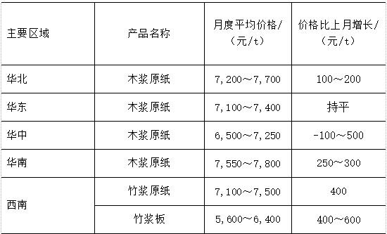 西南地區部分企業自產竹漿價格上漲400~600元/t,竹漿原紙價格上漲約400元/t。