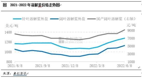 價格方面,通過上圖我們可以看出,2022年針葉溶解漿外盤價格、闊葉溶解漿外盤以及國內(nèi)闊葉溶解漿價格均呈現(xiàn)持續(xù)上行走勢。特別是進入二季度以來,由于原材料木片以及化學原料供應緊張且價格高位導致溶解漿外盤價格持續(xù)上漲。 據(jù)卓創(chuàng)資訊數(shù)據(jù)監(jiān)測,2022年二季度以來,針葉溶解漿外盤報價從4月1170-1180美元/噸,陸續(xù)上漲至1280-1300美元/噸,達到年內(nèi)高點,較年初低點上漲20%。隨著針葉漿到貨成本續(xù)增,國內(nèi)接貨趨于謹慎,目前新單仍在陸續(xù)商談。 闊葉漿整體成交良好,闊葉漿外盤報價從4月960-980美元/噸,逐漸上漲至1130-1150美元/噸,較年初低點上漲25%。6月8日,國內(nèi)闊葉溶解漿價格9500元/噸,同時處于年內(nèi)高點,較年初低點上漲41%,且6月國內(nèi)部分生產(chǎn)企業(yè)訂單已全部成交完畢,交投順暢。以下就國內(nèi)溶解漿基本面對價格的影響進行分析: 供應方面,截至6月8日,2022年國內(nèi)溶解漿供應較去年略有下滑,首先從國產(chǎn)情況來看,生產(chǎn)企業(yè)靈活轉(zhuǎn)產(chǎn),但產(chǎn)量較去年同期微幅下滑。同時,進口量受到海運壓力、船期延遲以及國際漿廠檢修等因素影響下,2022年1-4月中國溶解漿進口總量在118.04萬噸,同比2021年下滑6.38%。雖近期到貨存在緩慢恢復跡象,但現(xiàn)貨供應仍偏緊張,支撐國內(nèi)溶解漿價格上揚。 需求方面,粘膠短纖行業(yè)在供略大于求格局下,粘膠短纖生產(chǎn)廠家利潤空間受到明顯擠壓。據(jù)卓創(chuàng)資訊監(jiān)測數(shù)據(jù)顯示,2022年1-5月份粘膠短纖理論毛利在-917元/噸附近,同比減少2410元/噸左右。隨著主要原料溶解漿價格逐漸攀漲,粘膠短纖廠家利潤進一步被擠壓,且虧損明顯。二季度以來,主要原料溶解漿國內(nèi)市場季度均價環(huán)比上漲17.80%,成本壓力下帶動粘膠短纖價格逐漸上行,雖然粘膠短纖華東市場季度均價環(huán)比僅上漲10.99%,但對于國內(nèi)溶解漿市場心態(tài)也形成了一定利好影響。 后市預期來看,供應面存在提升預期,國產(chǎn)方面?zhèn)別轉(zhuǎn)產(chǎn)企業(yè)計劃6月中下旬復產(chǎn)溶解漿,進口方面主要來自于巴西Lenzing50萬噸新產(chǎn)能已投產(chǎn),其貨源或于7月底左右到達中國;需求方面,下游粘膠短纖雖利潤倒掛,但由于多數(shù)企業(yè)預收訂單充足,短期暫無壓力。整體來看,預計6月國內(nèi)溶解漿市場在上下游訂單充足以及進口木漿高位整理支撐下,心態(tài)形成互推作用,價格或表現(xiàn)較為堅挺。