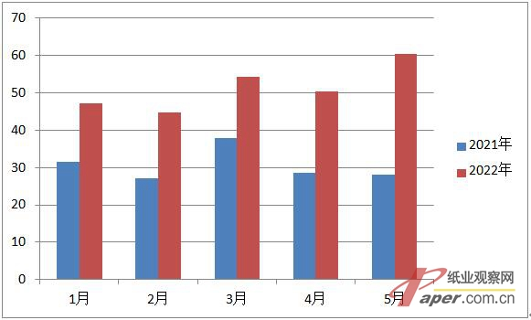 據(jù)紙業(yè)觀察網(wǎng)統(tǒng)計,2022年前5月,機(jī)制紙及紙板出口量均與2021年同期相比呈現(xiàn)大幅增長態(tài)勢。