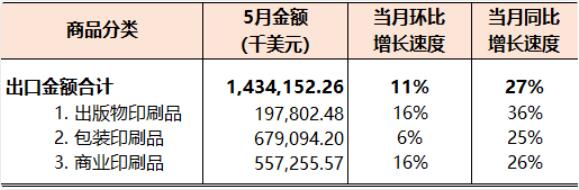 2022年5月國內印刷品出口14.34億美元(參見表3),環比增長11%、同比增長27%。其中,出版物印刷品出口1.97億美元(環比下增長16%、同比增長36%)、包裝印刷品出口6.79億美元(環比增長6%、同比增長25%)、商業印刷品出口5.57億美元(環比增長16%、同比增長26%)。 表3 2022年5月國內印刷品出口統計