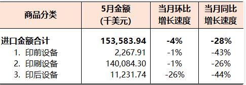 印刷裝備 2022年5月國內印刷裝備進口1.54億美元(參見表4),環比下降4%、同比下降28%。其中,印前設備進口226.79萬美元(環比下降1%、同比下降43%)、印刷設備進口1.40億美元(環比下降1%、同比下降26%)、印后設備進口1123.17萬美元(環比下降26%、同比下降44%)。 表4 2022年5月國內印刷裝備進口統計