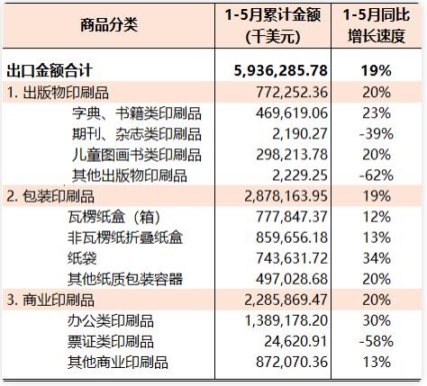 同期,相關印刷品主要子項進口,字典書籍類印刷品1.21億美元(同比下降21%)、期刊雜志類印刷品1.05億美元(同比增長247%)、兒童圖畫書類印刷品50.51萬美元(同比下降82%)、瓦楞紙盒(箱)1.30億美元(同比下降21%)、非瓦楞紙折疊紙盒1.71億美元(同比下降28%)、紙袋1.33億美元(同比下降36%)、辦公類印刷品8170.73萬美元(同比增長8%)、票證類印刷品4.23億美元(同比下降3%)、其他商業印刷品2.13億美元(同比下降10%)。 2022年1-5月國內印刷品出口59.36億美元(參見表9),同比增長19%。其中,出版物印刷品出口7.72億美元(同比增長20%)、包裝印刷品出口28.78億美元(同比增長19%)、商業印刷品出口22.86億美元(同比增長20%)。 表9 2022年1-5月國內印刷品出口統計