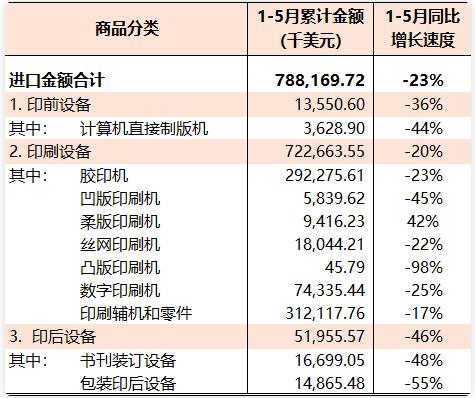 同期,相關印刷品主要子項出口,字典書籍類印刷品4.70億美元(同比增長23%)、期刊雜志類印刷品219.03萬美元(同比下降39%)、兒童圖畫書類印刷品2.98億美元(同比增長20%)、瓦楞紙盒(箱)7.78億美元(同比增長12%)、非瓦楞紙折疊紙盒8.60億美元(同比增長13%)、紙袋7.44億美元(同比增長34%)、辦公類印刷品13.89億美元(同比增長30%)、票證類印刷品2462.09萬美元(同比下降58%)、其他商業印刷品8.72億美元(同比增長13%)。 2022年1-5月國內印刷品進出口貿易順差49.44億美元(同比增長25%)。 印刷裝備 2022年1-5月國內印刷裝備進口7.88億美元(參見表10),與去年同期相比下降23%。其中,印前設備進口1355.06萬美元(同比下降36%)、印刷設備進口7.23億美元(同比下降20%)、印后設備進口5195.56萬美元(同比下降46%)。 表10 2022年1-5月國內印刷裝備進口統計