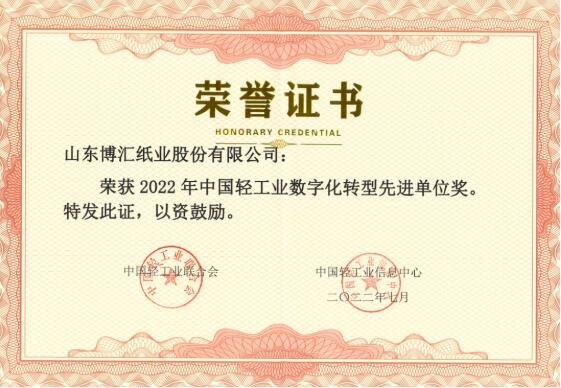 會上,山東博匯紙業股份有限公司榮獲“2022年中國輕工業數字化轉型先進單位獎”表彰。