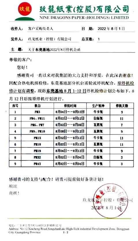 7月26日,東莞玖龍紙業7-8月份停機函公布。8月1日,玖龍紙業發函表示:東莞基地原停機檢修計劃有調整,現將其8月1-12日停機檢修計劃公布如下,8月12日后按原停機計劃進行。