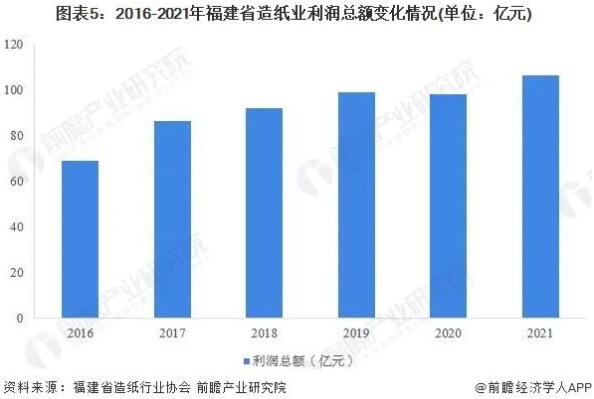 在利潤總額方面,2016年以來,全省造紙業實現利潤總額持續增長,2021年,隨著福建省造紙企業復產復工帶來的產能產量提升,全年實現利潤總額106.01億元,同比增長10.2%。
