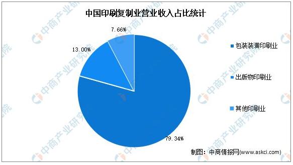 隨著生產工藝、技術水平的提升以及綠色環保概念的普及,紙制印刷包裝物因具有生產原料來源廣泛、成本低、便于物流運輸、易于儲存和包裝物可回收等優勢,已經可以部分取代塑料包裝、金屬包裝、玻璃包裝等多種包裝形式,應用范圍越來越廣。 營業收入占比 印刷包裝產品在滿足大眾化需求的同時,呈現品質化、個性化、定制化趨勢,綠色印刷、數字印刷迅猛發展。2020年全國印刷復制業實現營業收入11991.02億元,利潤總額555.02億元。其中,包裝裝潢印刷營業收入9503.31億元,占整個印刷復印業主營業務收入的比重為79.25%。
