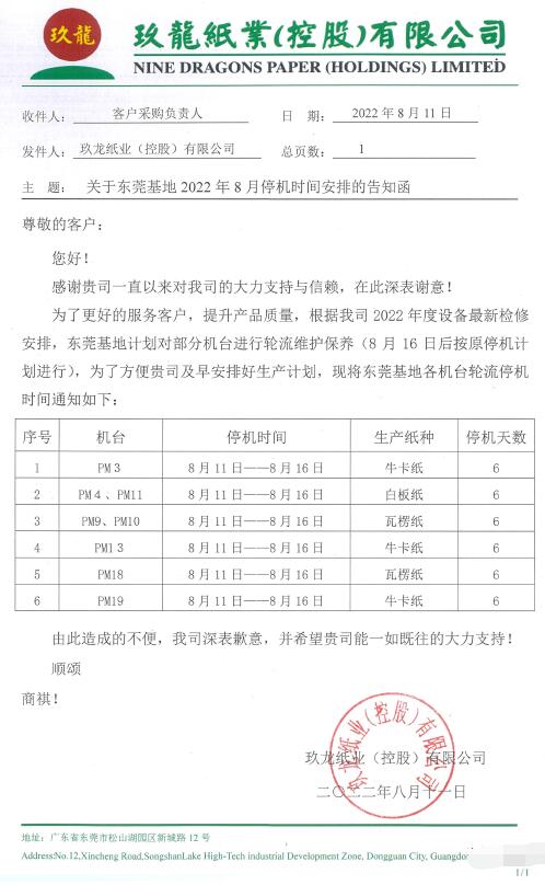玖龍紙業再度發布了東莞基地的停機檢修計劃,8臺包裝紙機自8月11日起停機6天;8月16日后按原停機計劃進行。 根據設計產能計算,此次停機的8臺紙機預計減少箱板瓦楞紙和灰底白板紙供應合計約5.21萬噸。