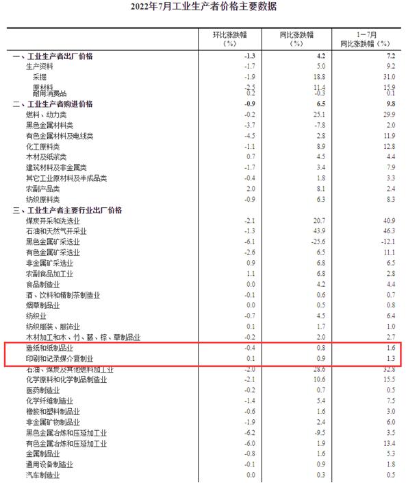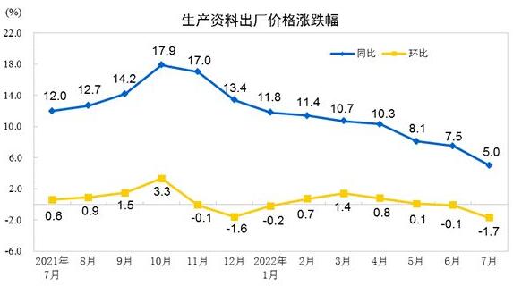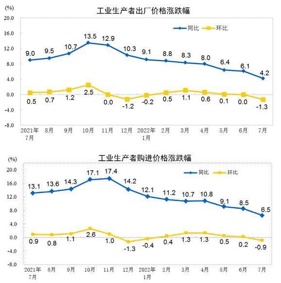 近日,國(guó)家統(tǒng)計(jì)局發(fā)布2022年7月份工業(yè)生產(chǎn)者出廠價(jià)格變動(dòng)情況。2022年7月份,全國(guó)工業(yè)生產(chǎn)者出廠價(jià)格同比上漲4.2%,環(huán)比下降1.3%;工業(yè)生產(chǎn)者購(gòu)進(jìn)價(jià)格同比上漲6.5%,環(huán)比下降0.9%。1—7月平均,工業(yè)生產(chǎn)者出廠價(jià)格比去年同期上漲7.2%,工業(yè)生產(chǎn)者購(gòu)進(jìn)價(jià)格上漲9.8%。