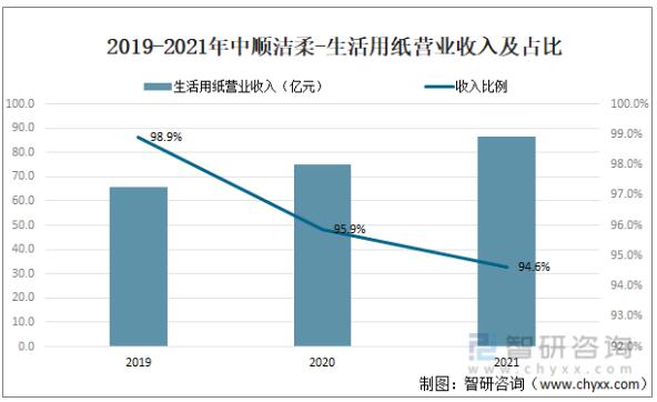 資料來源:智研咨詢整理 中順潔柔的生活用紙業(yè)務(wù)集中度在三家企業(yè)中是最高的,2021年中順潔柔-生活用紙營業(yè)收入為86.58億元,收入比例為94.6%。 2019-2021年中順潔柔-生活用紙營業(yè)收入及占比