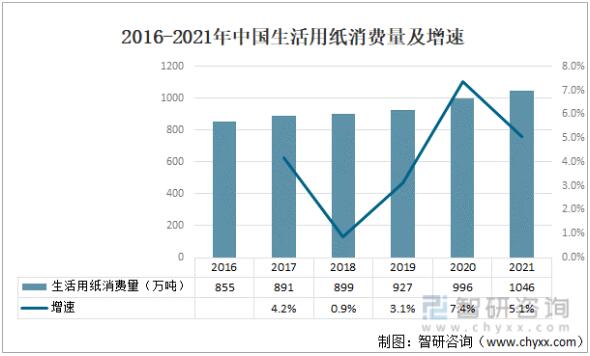 資料來源:中國造紙協(xié)會、智研咨詢整理 生活用紙主要供人們生活日常衛(wèi)生之用。所以在紙業(yè)同行用語通常叫生活用紙,是人民生活中不可或缺的紙種之一。2021年中國生活用紙消費量約為1046萬噸,同比增長5.1%。 2016-2021年中國生活用紙消費量及占比