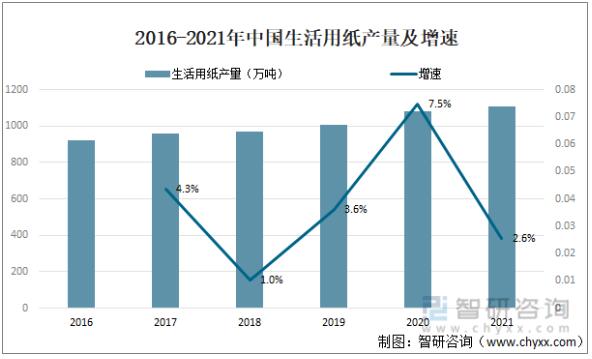 生活用紙指為照顧個人居家,外出等所使用的各類衛(wèi)生擦拭用紙,包括卷筒衛(wèi)生紙、抽取式衛(wèi)生紙、盒裝面紙、袖珍面紙、手帕紙、餐巾紙、廚房用紙、濕巾、擦鞋紙、擦手紙等。2021年中國生活用紙產(chǎn)量為1107.6萬噸,同比增長9.1%。 2016-2021年中國生活用紙產(chǎn)量及增速