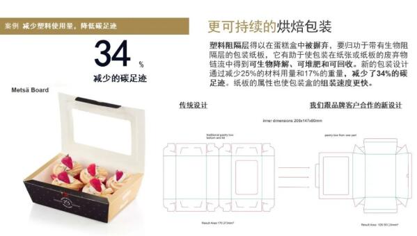 以高效、可持續(xù)方式生產(chǎn)的紙板產(chǎn)品,在保持包裝性能的前提下使重量減輕、可替代塑料,幫助客戶提高成本效益的同時(shí)減少碳足跡,實(shí)現(xiàn)產(chǎn)品全生命周期的減排目標(biāo)。芬林紙板技術(shù)服務(wù)總監(jiān)葉強(qiáng)所展示的烘焙包裝案例中,帶有生物阻隔層的包裝紙板有助于使包裝在紙張或紙板的廢棄物鏈流中得到可生物降解、可堆肥和可回收。且新的包裝設(shè)計(jì)通過(guò)減少25%的材料用量和17%的重量,減少了34%的碳足跡。