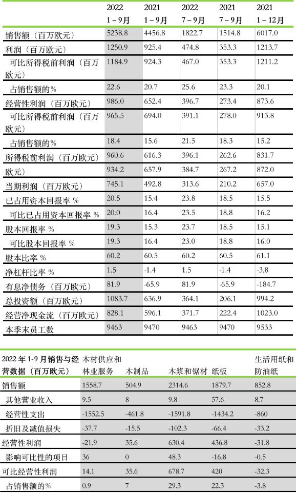 2022年1-9月(2021年1-9月同比數據) 銷售額為 52.39 億歐元(同比:44.57 億歐元); 經營性利潤為 9.86 億歐元(同比:6.52 億歐元);可比經營性利潤為 9.66 億歐元(同比:6.94 億歐元); 稅前利潤為 9.61 億歐元(同比:6.16 億歐元);可比稅前利潤為 9.34 億歐元(同比:6.58 億歐元); 可比已占用資本回報率為 20.0%(同比:16.4%); 經營性凈現金流為 8.28 億歐元(同比:5.96 億歐元); 2022年7-9月(2021年7-9月同比數據) 銷售額為 18.23 億歐元(同比:15.15 億歐元); 經營性利潤為 3.97 億歐元(同比:2.73 億歐元);可比經營性利潤為 3.91 億歐元(同比:2.78 億歐元); 稅前利潤為 3.96 億歐元(同比:2.63 億歐元);可比稅前利潤為 3.85 億歐元(同比:2.67 億歐元); 可比已占用資本回報率為 23.5%(同比:18.8%); 經營性凈現金流為 3.72 億歐元(同比:2.22 億歐元) 2022年第三季度主要事件 芬林集團長纖漿的平均銷售價格環比上漲。 歐洲和北美市場對芬林紙板生產的折疊紙板需求保持穩定。歐洲市場對白牛卡需求略有下降。紙板均價以歐元計環比上漲。 芬林紙板已啟動卡斯基寧(Kaskinen)年產能 80萬 噸折疊紙板工廠的前期工程設計,最早可能在 2024 年作出投資決策。 新落成的勞馬(Rauma)松木鋸材廠于 9 月底正式投產。該項目投資額約為 2.6 億歐元。 曼塔(M?ntt?)工廠的生活用紙機經技改后也于 9 月開始正式投產。該項投資將紙機的產能提高了15%,同時生產效率和能效也得到提升。 芬林集團采用道德晴雨表評測企業文化中的責任,與兩年前的第一次評測結果相比,今年的評測結果有所改善。 俄烏沖突對芬林集團業務運營的影響 俄烏沖突已對芬林集團的業務運營產生一定影響。芬林集團在俄羅斯唯一的生產工廠——斯維爾(Svir)鋸材廠目前已中斷運營,從該國采購木材的業務也已中斷。面向俄羅斯和白俄羅斯的產品交付工作也被迫暫停。 替換俄羅斯木材來源的工作已按計劃進行。俄烏沖突和隨之而來的制裁對能源供應將產生影響。目前面臨最嚴峻的挑戰是生產所需的天然氣供應和對相關成本的管理。一系列旨在取代天然氣的措施正在按計劃進行中。 新冠病毒疫情 芬林集團嚴格遵守有關部門發布的新冠病毒防疫指南。今年 5 月,隨著新冠疫情好轉,芬林集團解除了相關的限制措施。自 8 月初開始,針對可居家辦公的崗位,芬林集團采用了遠程辦公和現場辦公相結合的工作模式。新冠疫情期間的資源供給正常,除少數例外情況,生產和交貨一直正常進行。 2022年10-12月的業績預測 芬林集團預計2022年10-12月的可比營業利潤將低于2022年7-9月。