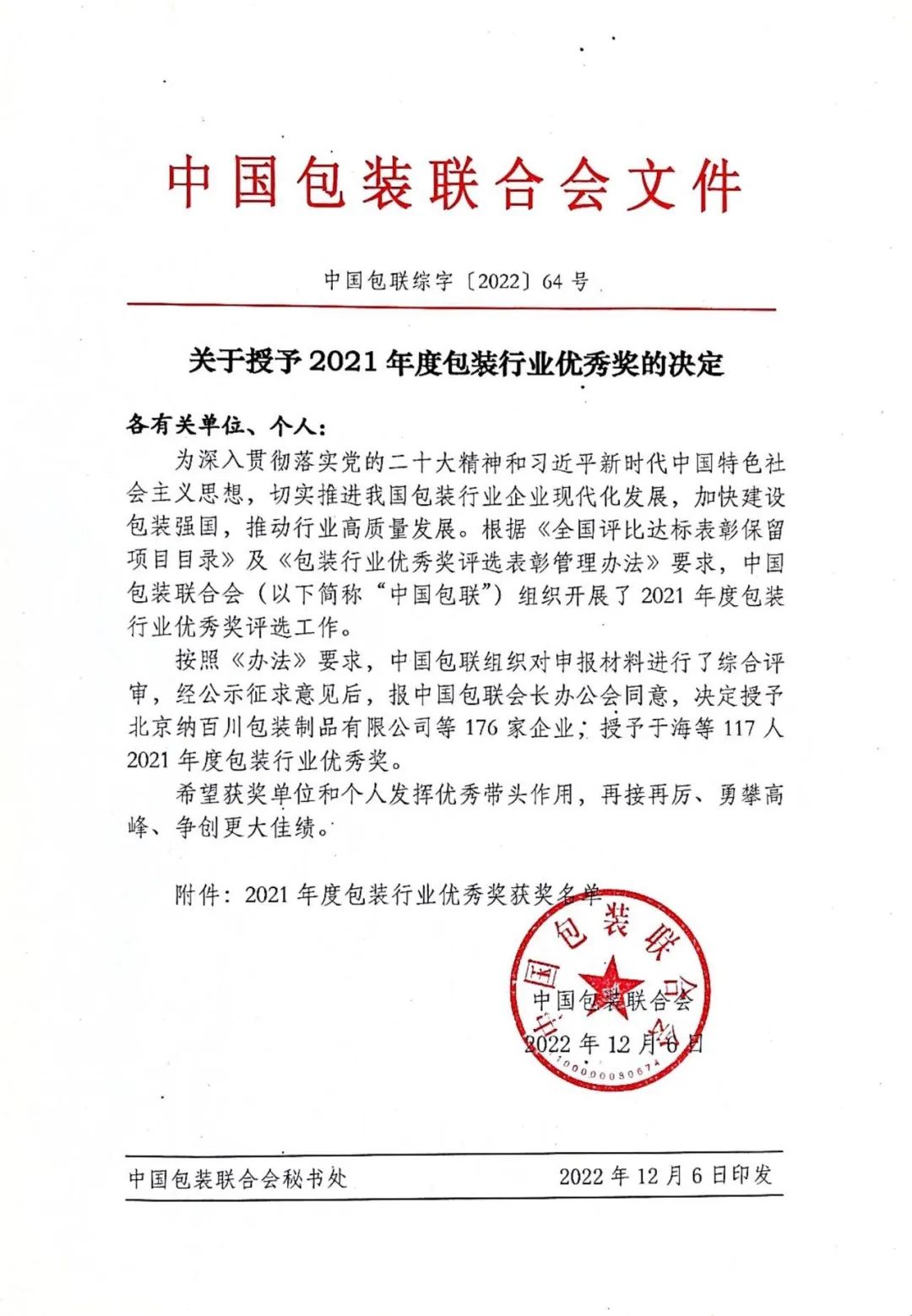 為推進我國包裝行業企業現代化發展,加快建設包裝強國,推動行業高質量發展。根據《全國評比達標表彰保留項目目錄》及《包裝行業優秀獎評選表彰管理辦法》要求,中國包裝聯合會組織開展了2021年度包裝行業優秀獎評選工作。