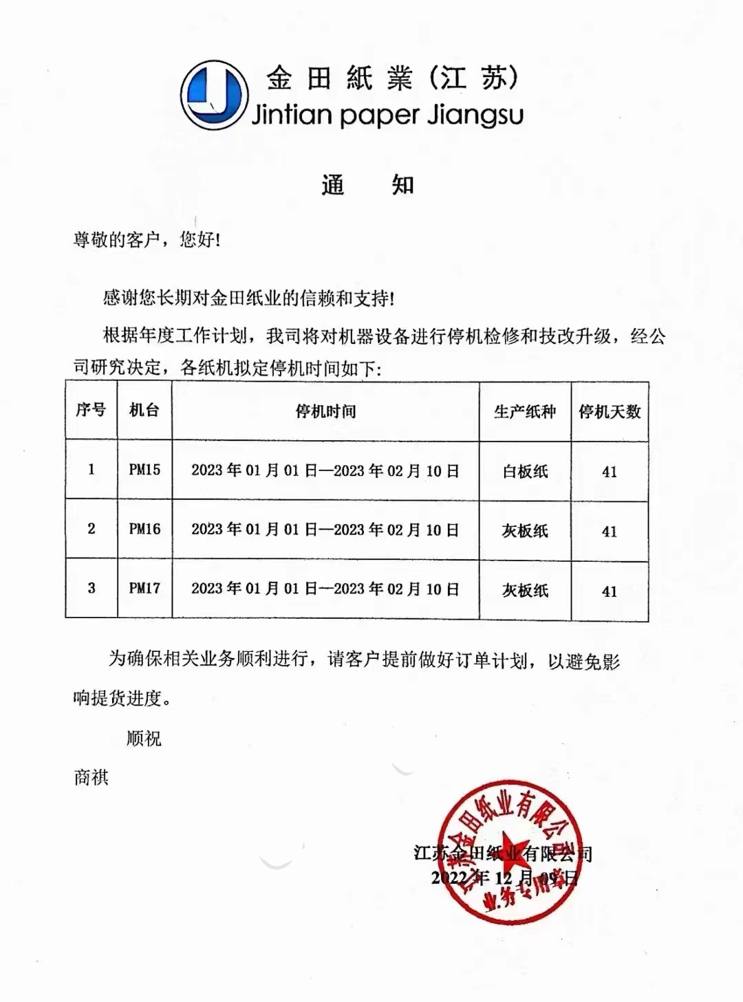 此前,東莞市金田紙業還發布了停機通知,其PM1、PM2、PM3、PM5、PM6、PM7、PM8共七臺灰板紙機,以及牛卡紙機PM13均將在2023年1月1日-2023年2月10日停機41天。