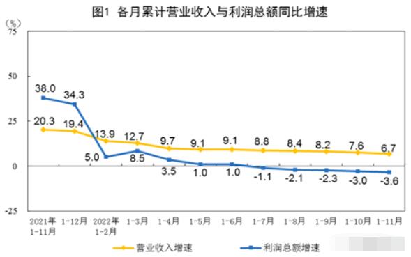 12月27日,國家統計局官網發布了2022年1-11月份全國規模以上工業企業利潤情況。數據顯示,今年前11月,全國規模以上工業企業實現利潤總額77179.6億元,同比下降3.6%。