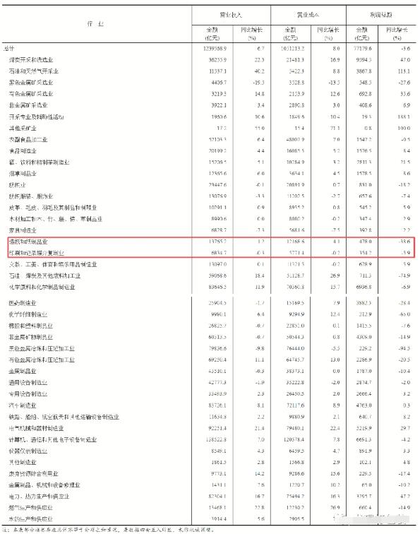 在41個工業大類行業中,20個行業利潤總額同比增長,21個行業下降。其中,造紙和紙制品業利潤總額478.0億元,同比下降38.6%。印刷和記錄媒介復制業利潤總額354.2億元,同比下降5.9%。