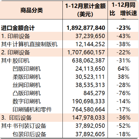 2022年1-12月國內印刷品進出口貿易順差133.27億美元(同比增長13%)。 印刷裝備 2022年1-12月國內印刷裝備進口18.93億美元(參見表4),與去年同期相比下降23%。其中,印前設備進口0.37億美元(同比下降43%)、印刷設備進口17.08億美元(同比下降22%)、印后設備進口1.48億美元(同比下降36%)。 同期,相關設備主要進口品種:計算機直接制版機158臺、0.12億美元(同比下降38%);膠印機1130臺、6.38億美元(同比下降31%);凹版印刷機51臺、0.24億美元(同比增長64%);柔版印刷機42臺、0.31億美元(同比增長38%);絲網印刷機313臺、0.39億美元(同比下降28%);數字印刷機21.01萬臺、1.91億美元(同比下降14%);印刷輔機和零件7.65億美元(同比下降17%);書刊裝訂設備2889臺、0.38億美元(同比下降52%);包裝印后設備130臺、0.38億美元(同比下降18%)。 表4 2022年1-12月國內印刷裝備進口統計