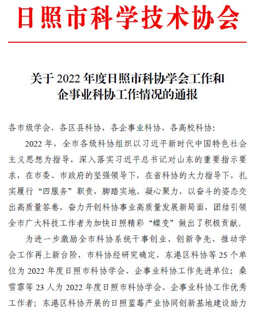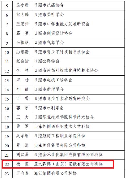 2月8日,日照市科學技術協會發布了《關于2022年度日照市科協學會工作和企事業科協工作情況的通報》,亞太森博(山東)漿紙有限公司科協被評為“2022年度日照市科協學會、企事業科協工作先進單位”,公司“我是小小造紙家”科普活動被評為“企事業科協工作典型案例”,公司科協委員楊恒被評為“企事業科協工作優秀工作者”。