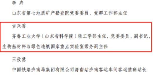 2023年3月24日,為深入學習貫徹黨的二十大精神,大力弘揚勞模精神、勞動精神、工匠精神,團結動員廣大女職工為全面建設社會主義現代化國家、全面推進中華民族偉大復興貢獻力量,中華全國總工會在北京隆重召開2023年全國五一巾幗獎表彰大會。大會表彰了450個全國五一巾幗標兵崗、450名全國五一巾幗標兵。齊魯工業大學(山東省科學院)輕工學部主任,黨委委員、副書記,生物基材料與綠色造紙國家重點實驗室常務副主任,協會副會長吉興香被授予“全國五一巾幗標兵”稱號。