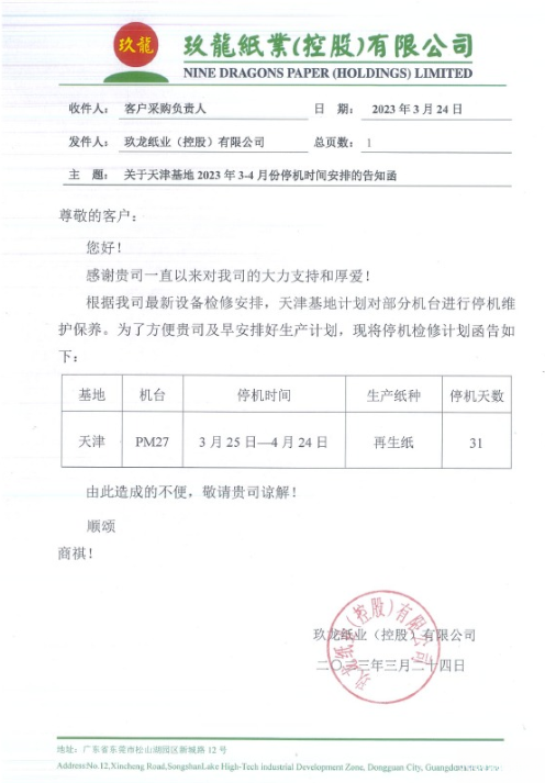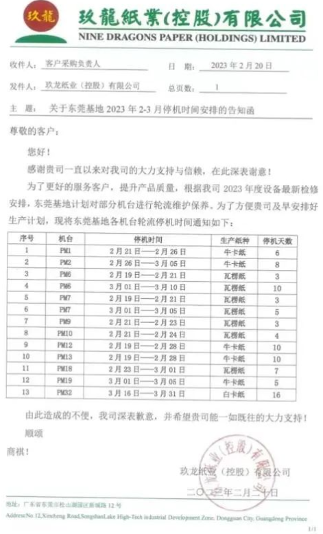 (東莞玖龍2-3月份停機計劃) 這是東莞玖龍紙業自開年以后的第二輪大規模停機計劃,2-3月份,該基地就已有11臺紙機輪流停產3-16天。對比兩份停機通知函可以發現,大多數紙機如PM1、PM2、PM6、PM7、PM9、PM10、PM12、PM19、PM32在2-3月份參與停機后,3-4月將繼續停機數日。