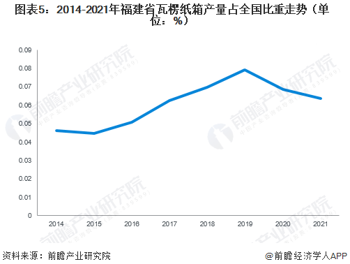 福建省紙制品包裝行業(yè)地位分析 根據(jù)中國包裝聯(lián)合會數(shù)據(jù)統(tǒng)計(jì),2014-2019年,福建省瓦楞紙箱產(chǎn)量占全國比重整體呈現(xiàn)上升趨勢;2015年,福建省瓦楞紙箱產(chǎn)量占全國比重降至近年最低點(diǎn),為4.46%,隨后開始持續(xù)提升,近兩年來有所回落。2021年,福建省瓦楞紙箱產(chǎn)量占全國比重為6.35%,排名第六。