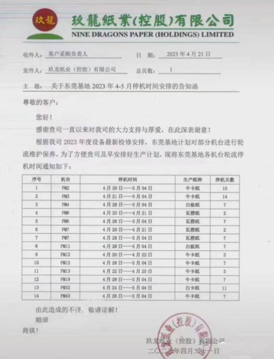 東莞玖龍紙業最新停機計劃來襲!4月21日,東莞玖龍紙業發布4-5月停機時間安排,11臺紙機將在4月20日-5月4日期間輪流停機2-15天,涉及牛卡、瓦楞、白板、白卡等包裝紙類。